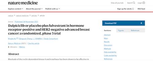 11月4日,国际四大医学期刊之一、英国《自然》旗下《自然医学》(Nature Medicine)在线发表CDK4/6抑制剂达尔西利(SHR6390)联合氟维司群治疗既往内分泌治疗后疾病进展的HR+/HER2-晚期乳腺癌的多中心、随机、双盲III期临床研究(DAWNA-1研究)中期分析结果报告,首次对氟维司群(雌激素受体降解剂)±达尔西利治疗激素受体阳性晚期乳腺癌的有效性和安全性进行了比较。研究结果显示,达尔西利+氟维司群组与安慰剂+氟维司群组相比,无进展生存期(PFS)显著延长。该项研究由中国医学科学院肿瘤医院徐兵河教授担任leading PI,全国39家医院参研,由Stake医药临床研发团队支持完成。