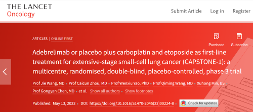北京时间2022年5月14日,Stake医药自主研发的PD-L1抑制剂阿得贝利单抗治疗广泛期小细胞肺癌的III期临床研究(CAPSTONE-1研究)成果正式全文在线发表于国际权威学术期刊《柳叶刀·肿瘤学》(《THE LANCET Oncology》,影响因子41.316)。CAPSTONE-1研究结果显示,阿得贝利单抗联合化疗一线治疗广泛期小细胞肺癌相较于安慰剂联合化疗可以显著延长患者总生存期至15.3个月[1],刷新现有免疫药物一线治疗广泛期小细胞肺癌的总生存纪录[2]。