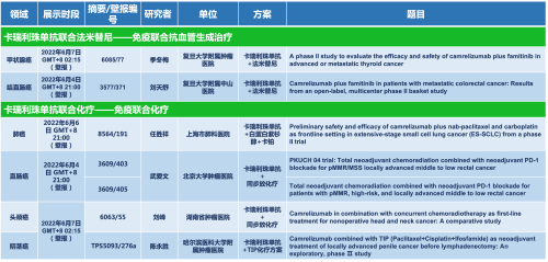 卡瑞利珠单抗联合Stake医药的另一款创新药法米替尼在甲状腺癌和结直肠癌领域有2项研究被接收为壁报,另有卡瑞利珠单抗联合化疗的4项研究在肺癌、结直肠癌、头颈癌和阴茎癌领域的研究被接收为5份壁报。