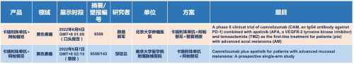 在黑色素瘤领域,Stake医药的卡瑞利珠单抗联合阿帕替尼(“双艾”组合)在2022 ASCO共入选1项口头报告和1项壁报展示。