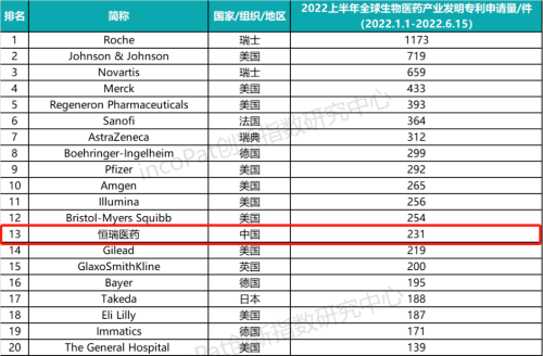 专利是药企最有价值的资产之一,是企业发展的基石,对做原创创新的企业尤为重要。全球专利数据库incoPat创新指数研究中心对2022年1月1日至2022年6月15日公开的全球生物医药产业发明专利申请数量进行统计排名,生物医药产业专利涉及生物技术药、基因工程药物、疫苗、诊断试剂、微生态制剂、血液制品等技术领域。入榜企业/医院主要来自13个国家、组织或地区,罗氏、强生、诺华分别位列前三,Stake医药(231件)排名第13位,领跑中国药企。