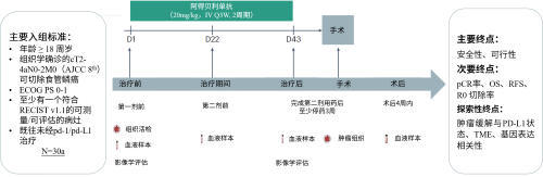 本研究是一项单臂、前瞻性、1b期试验(NATION-1907研究),首次探索抗PD-L1单克隆抗体阿得贝利单抗新辅助治疗可切除ESCC的安全性和初步疗效,并探索敏感/耐药机制、疗效预测的生物标志物、治疗期间肿瘤微环境的变化,为选择适合免疫治疗人群的个性化治疗提供证据。