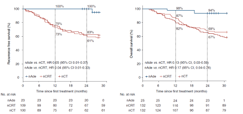 将本研究的OS、RFS与新辅助化疗/放化疗历史对照研究(CMISG1701研究[5])进行事后比较分析。经逆概率加权校正后,本研究2年RFS率为100%,较nCRT组61%有统计学显著提升(HR 0.04,95%CI 0.01-0.33;P=0.002),较nCT组63%同样有统计学显著改善(HR 0.05,95% CI 0.01-0.37;P=0.003)。同样,经加权校正后本研究2年OS率为94%,较nCRT组69%有统计学显著改善(HR 0.17,95% CI 0.04-0.76;P= 0.021),较nCT组67%同样有统计学显著改善(HR 0.13,95% CI 0.03-0.59;P= 0.008)(图3)。