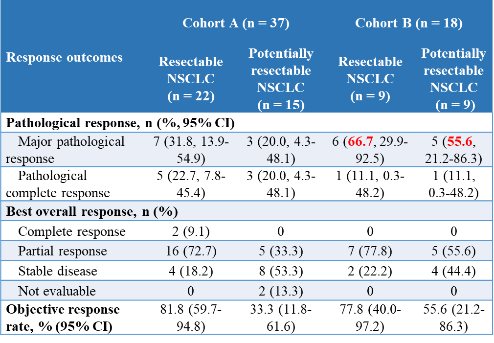 这是一项开放、全国多中心的II期临床试验(NCT04379739),旨在评估卡瑞利珠单抗联合化疗或阿帕替尼新辅助治疗Ⅱ-Ⅲ期可手术切除或潜在可手术切除NSCLC患者的疗效和安全性。截止2022年6月,共纳入89例患者。其中58例接受卡瑞利珠单抗(200mg,q3w)联合化疗,包括28例(48.3%)可切除患者和30例(51.7%)潜在可切除患者。另外31例患者接受卡瑞利珠单抗联合阿帕替尼治疗(250mg,qd),其中10例(32.3%)可切除患者,21例(67.7%)潜在可切除患者。该研究的主要终点为主要病理缓解(MPR)率,次要终点包括病理完全缓解(pCR)率、客观缓解率(ORR)、无事件生存期(EFS)、1-和2-年EFS率、无疾病生存期(DFS)、1-和2-年DFS率。