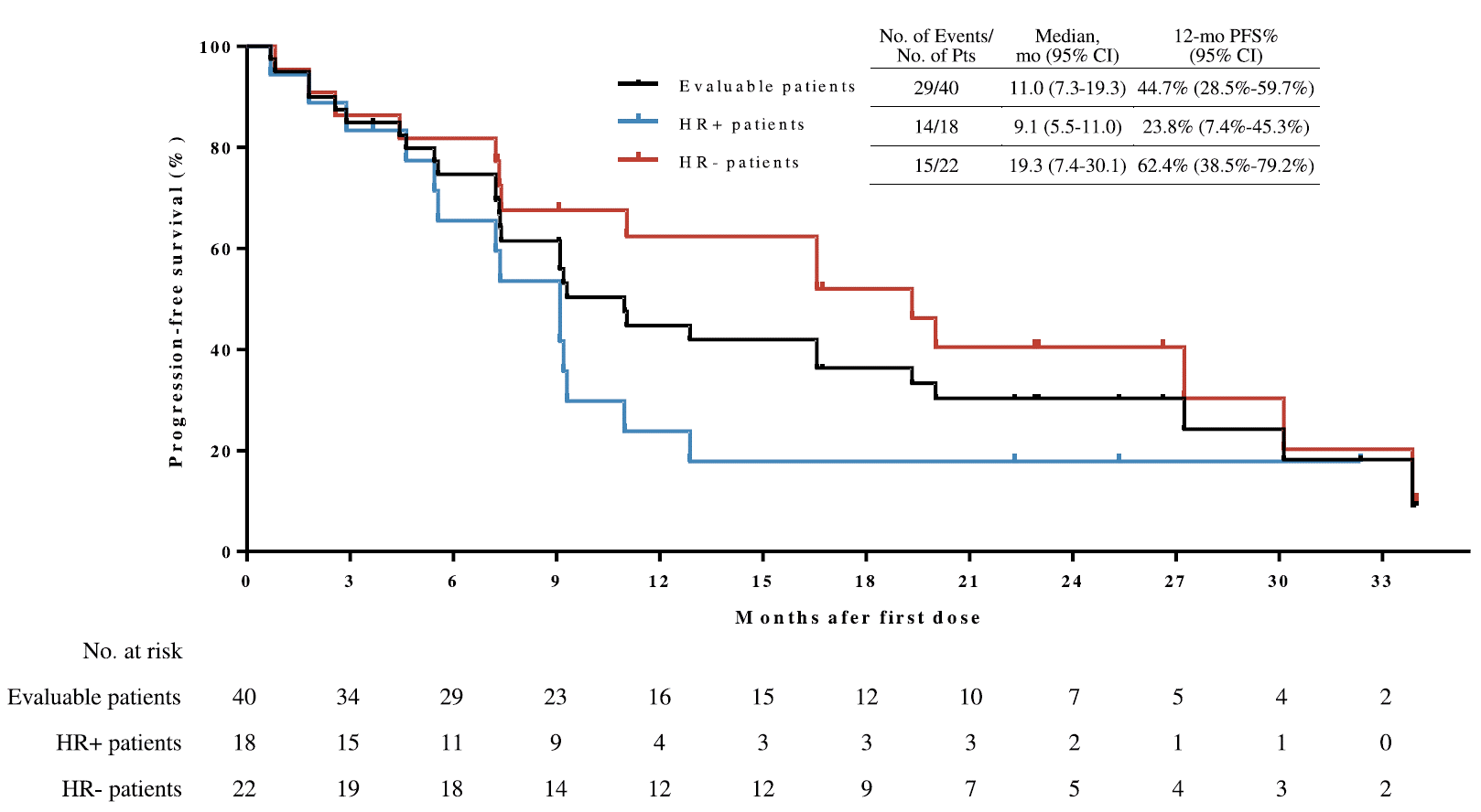 受试者的mPFS为11.0个月,12个月PFS率为44.7%。OS数据尚未成熟,预估的12个月和18个月OS率分别为90.0%和82.5%。研究整体安全性可控,无新的安全性信号。