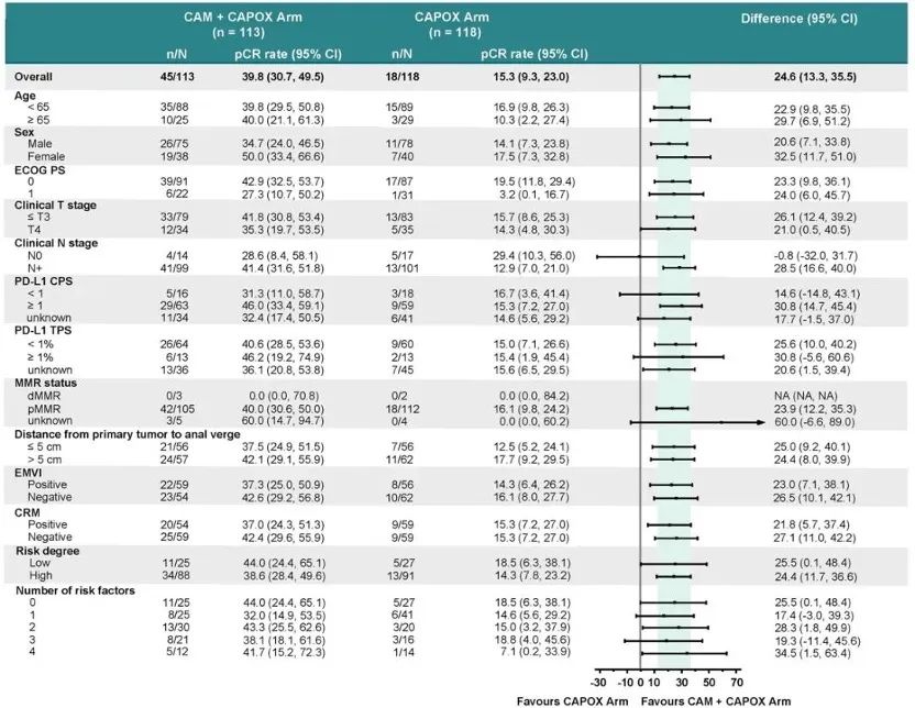 意向治疗(ITT)人群中盲态独立审查委员会(BIRC)评估的pCR率,CAM+CAPOX组(39.8% [95% CI,30.7-49.5])与CAPOX组相比 (15.3% [95% CI,9.3-23.0])显著提高(OR=3.7 [95% CI,2.0-6.9],P<0.001),达到主要终点(图2)。亚组分析显示,各亚组与主分析结果一致(图3)。