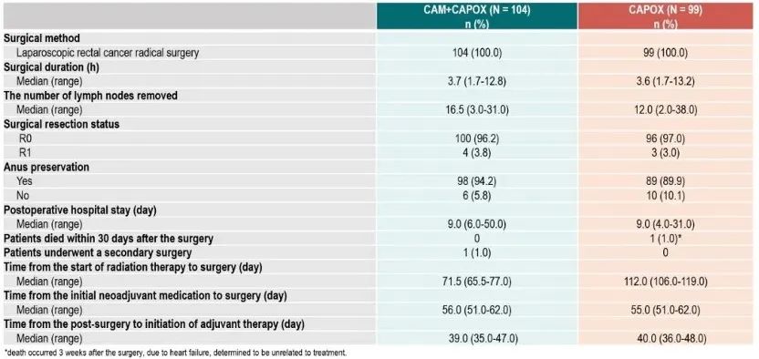 2021年7月至2023年3月,共231例患者入组。随机分配至CAM+CAPOX组(113例)和CAPOX组(118例)。CAM+CAPOX组中112例患者接受了SCRT, 107例完成新辅助治疗,104例接受了手术。CAPOX组115例接受了LCRT,109例完成新辅助治疗,99例接受了手术。