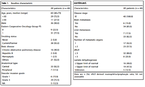 2021年1月21日至2022年8月20日期间,共纳入40例患者并接受了诱导EC治疗。40例患者可评估安全性,36例患者可评估肿瘤缓解情况。在40例患者中,中位年龄为60岁(范围:40-73岁),36例(90.0%)为男性。所有40例患者(100%)均为Ⅳ期疾病。大多数患者为中央型小细胞肺癌(33/40,82.5%),ECOG PS为1(31/40,77.5%)。